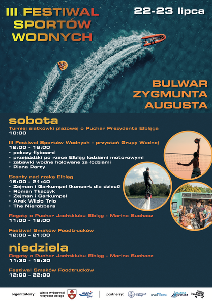 Mnóstwo bezpłatnych atrakcji, pokazów, wycieczek, muzyki szantowej i animacji dla dzieci. Tak będzie wyglądał III Festiwal Sportów Wodnych w Elblągu. Rzeka Elbląg wypełni się łodziami, bulwar Zygmunta Augusta muzyką szantową i food truckami, a przystań kolorową pianą. Przyjdź i spędź czas razem z MOSiR-em.
