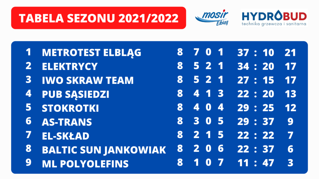 Obrońcą tytułu jest ekipa Metrotestu Elbląg, która także w trwającym sezonie idzie po kolejny złoty medal. Ci mistrzowie mogliby powiedzieć, że rozegrali idealną rundę, ale w takim osiągnięciu przeszkodziła im drużyna Stokrotek, która w lidze jako jedyna zdołała z nimi wygrać. Jednak i tak Metrotest triumfował w 7 innych pojedynkach. To sprawia, że posiada przewagę 4 punktów nad goniącymi go Elektrykami i IWO SKRAW TEAM, który pokonali 6:4, a 4 gole zdobył wtedy Radosław Prusak. Dysponuje również najszczelniejszą obroną i najskuteczniejszym atakiem, dlatego zasłużenie jest na pozycji lidera i może z dużym optymizmem spoglądać na rundę wiosenną.