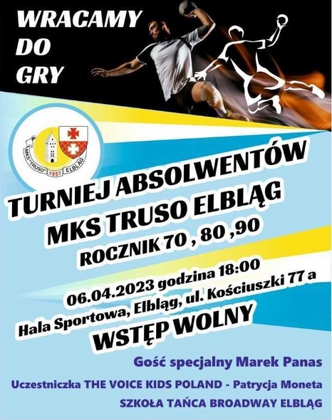 15 marca opublikowaliśmy tekst, w którym poinformowaliśmy o działaniach grupy pasjonatów piłki ręcznej, którzy chcieliby reaktywować seniorską drużynę w Elblągu. Zapowiadaliśmy też, że pierwszym krokiem ma być mini turniej wychowanków MKS Truso, którzy grali w szczypiorniaka. Dziś możemy oficjalnie napisać: 6 kwietnia w hali Zespołu Szkół i Placówek Sportowych (dawna hala MOS) przy ulicy Kościuszki zmierzą się wychowankowie Truso z roczników lat 90., 80. i 70.