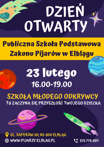 Zapraszamy na Dzień Otwarty naszej szkoły w środę (23 lutego), w godz. 16.00 - 19.00, do budynku szkoły, który znajduje się przy ul. Saperów 20 w Elblągu.
