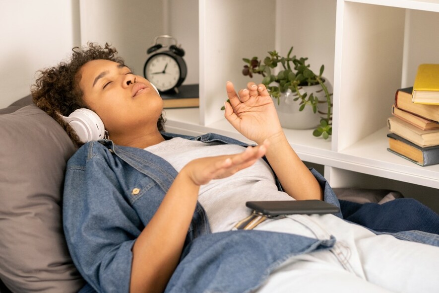 Postawienie na znane i lubiane przez siebie dźwięki, pozwala na odprężenie się, a także odsuwa myśli od analizowania problemów. W tym celu dobrze sprawdza się spokojna muzyka, ale też inne dźwięki, budzące dobre skojarzenia. Dla osób, u których nie budzi to żadnych lęków, świetnym rozwiązaniem mogą być dostępne w Internecie playlisty z odgłosami burzy, które u wielu ludzi pozytywnie wpływają na jakość snu.
