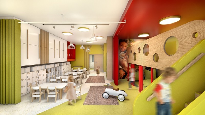 Na potrzeby żłobka przeznaczono osobną kondygnację, aby dzieci ze żłobka i przedszkola nie przeszkadzały sobie nawzajem w zajęciach edukacyjnych. Jednakże zarówno dzieci żłobkowe jak i przedszkolaki ze wszystkich grup będą razem bawiły się na placu zabaw oraz wspólnie uczestniczyły we wszystkich organizowanych atrakcjach, zabawach i zajęciach dodatkowych.