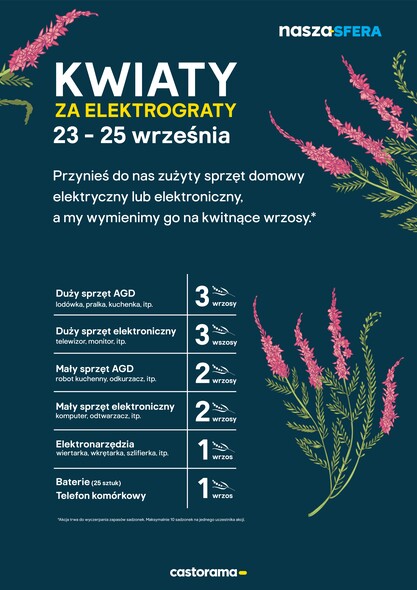 W ramach jesiennej akcji, w dniach 23-25 września za przyniesienie elektroodpadów do wszystkich sklepów sieci otrzymamy wrzosy. Im więcej zużytego sprzętu przyniesiemy, tym więcej ich otrzymamy. W ten sposób nie tylko zadbamy o środowisko i pozbędziemy się zbędnych rzeczy, ale będziemy mogli ucieszyć się pięknymi kwiatami. Innymi słowy: zyskujemy potrójnie!