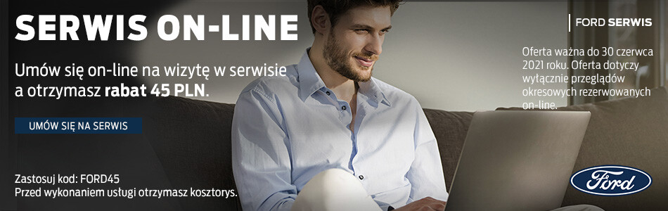 Zachęcamy do rezerwacji wizyty w serwisie wykorzystując opcję Serwis On-line, która gwarantuje bezpieczne serwisowanie pojazdu bez wychodzenia z domu. Obecnie trwa promocja, dzięki której na hasło FORD45 każdy Klient otrzyma rabat w wysokości 45 zł.