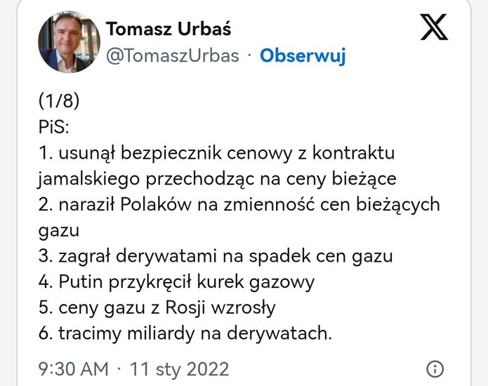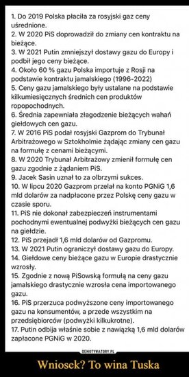 • "Do 2019 Polska płaciła za rosyjski gaz ceny uśrednione. W 2020 PiS doprowadził do zmiany cen kontraktu na bieżące. W 2021 Putin zmniejszył dostawy gazu do Europy i podbił jego ceny bieżące" - przekazywano. "Wiecie, czemu tak podrożał gaz? Bo Kaczyński nie mógł zdzierżyć, że Tusk wynegocjował dobre warunki" - podsumował jeszcze Bezprawnik. pl.