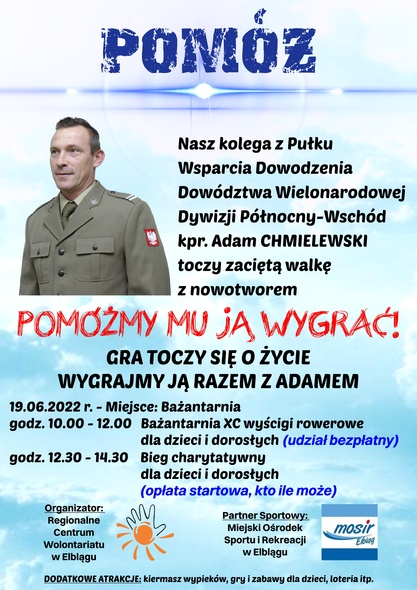 Kpr. Adam Chmielewski przez wiele lat służył w Pułku Wsparcia Dowodzenia Dowództwa Wielonarodowej Dywizji Północny - Wschód oraz w 16 Batalionie Dowodzenia. W styczniu tego roku usłyszał okrutną diagnozę: nowotwór złośliwy płuc i mózgu. Na leczenie potrzebne są pieniądze. Adama wspierają przyjaciele i znajomi. Pomóc może każdy biorąc udział w charytatywnym biegu, z którego cały dochód zostanie przeznaczony na leczenie żołnierza.
