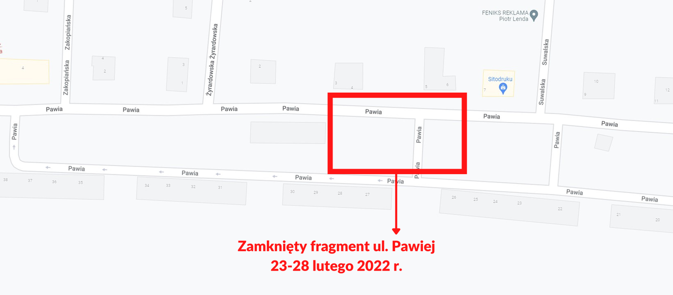 W związku z tym, między 23 a 28 lutego, na ul. Pawiej wprowadzona zostanie czasowa zmiana organizacji ruchu. Dla ruchu drogowego i pieszego zamknięty zostanie odcinek od nr 3 do nr 6, wraz z łącznikiem - jak zaznaczono na poniższej grafice - zgodnie z zatwierdzonym projektem organizacji ruchu.