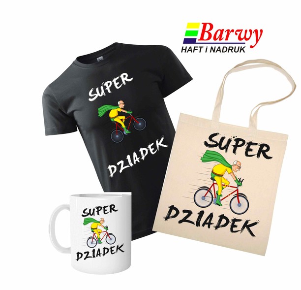 W naszej firmie Barwy przygotowaliśmy propozycję prezentów. Motywem wiodącym są "odmłodzeni dziadkowie", humorystycznie przedstawieni jako aktywne, pełne wigoru osoby. Aplikacje umieszczamy na koszulkach, kubkach oraz torbach. Dzięki temu każdy może wybrać odpowiednią rzecz dla seniora lub skompletować cały zestaw. Możliwości jest dość sporo, zwłaszcza, że jest możliwość spersonalizowania każdego z tych produktów. Na życzenie klienta pod napisem Babcia lub Dziadek możemy wydrukować na przykład imię. Wszystko drukujemy u nas w zakładzie, na miejscu. Stąd też terminy wykonania są bardzo przyzwoite.