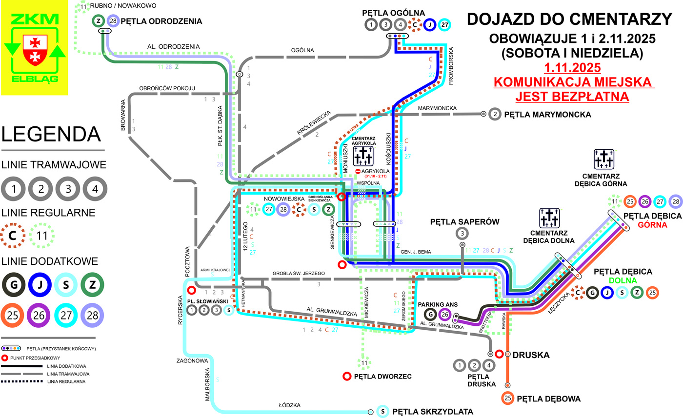 Przejazdy komunikacją miejską w Elblągu będą bezpłatne tylko 1 listopada 2025 (sobota). Tak jak w poprzednich latach, 1 i 2 listopada (sobota i niedziela) utworzone zostaną dwie dodatkowe linie, zapewniające dojazd z parkingów przy al. Grunwaldzkiej (przy budynku ANS – b. PWSZ) do pętli przy Dębicy. Autobusy tych linii będą kursowały od 8:00 do ok. 18:00. Pętla linii G (Dębica DOLNA) i 26 (Dębica GÓRNA) będzie zlokalizowana na małym parkingu, obok budynku ANS (b.PWSZ). Z uwagi na planowane zmiany w organizacji ruchu, 1 i 2 listopada (sobota i niedziela) autobusy linii nr 11 nie będą dojeżdżały do Stagniewa.