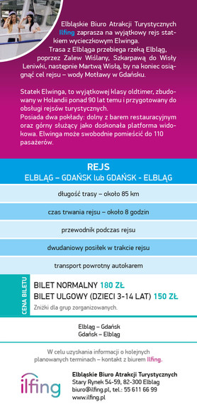Rejs statkiem z Elbląga do Gdańska to pokonanie 90 km drogą wodną w 8 godzin. Transport autokarem (ok. 1,5 godz.) zapewnia organizator wyprawy.
